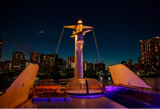 Available for use as either a floating restaurant or a cruise ship alone, this 120-guest capacity ship has three floors, accommodating a dining room, private deck, and private room, as well as a deck for enjoying the view. The ship is equipped with full kitchen facilities, ensuring that guests dining on board can enjoy fine French cuisine of the same quality as that offered in the Club House. Let the romance of the sea bring you and that special someone closer together on this cruise ship.