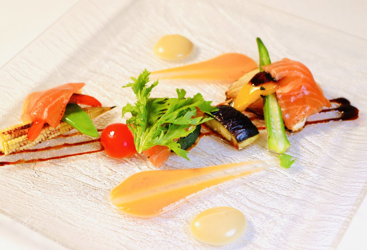 自家製スモークサーモンと彩り野菜の軽いマリネ
