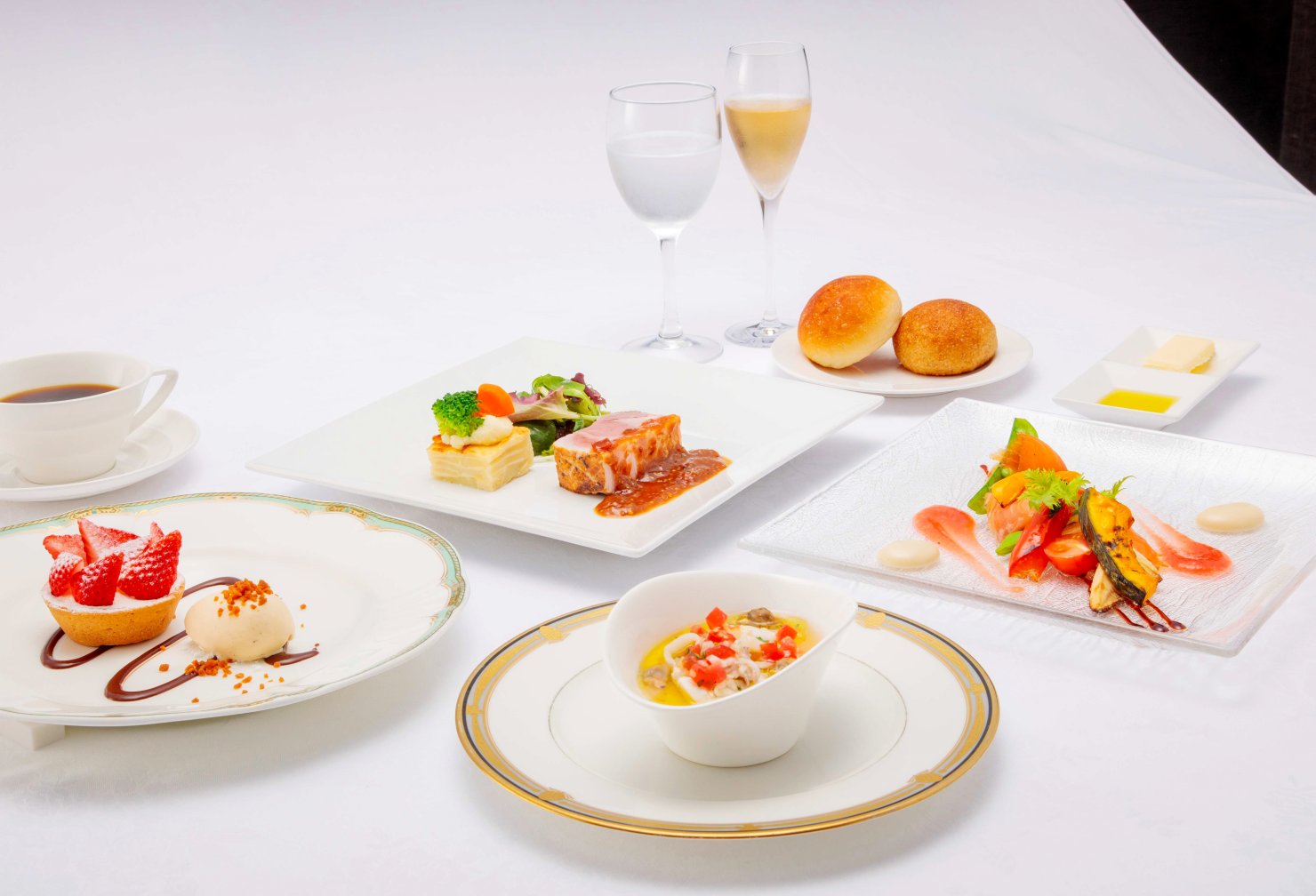 まずは水辺のクラブハウスで乾杯ドリンクから始まる旬な食材を使用したフレンチランチコースをゆったりとお楽しみください。