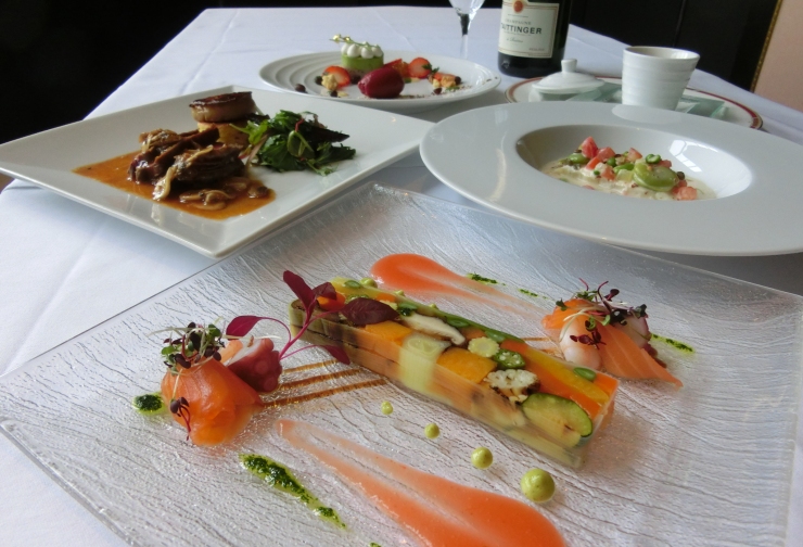 シーフードのサラダ添え フレッシュトマトのクーリー Placque de légumes saison avec salade de fruits de mer -