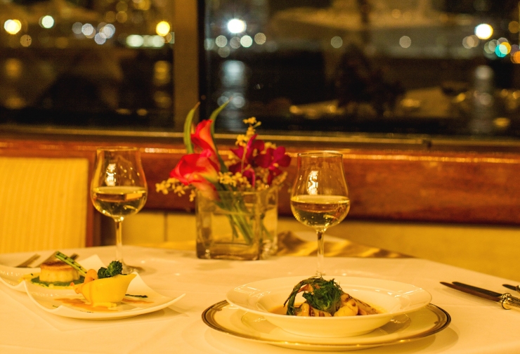 船内のキッチンでシェフが腕をふるう厳選素材のフレンチは、季節をお皿に映したような逸品。